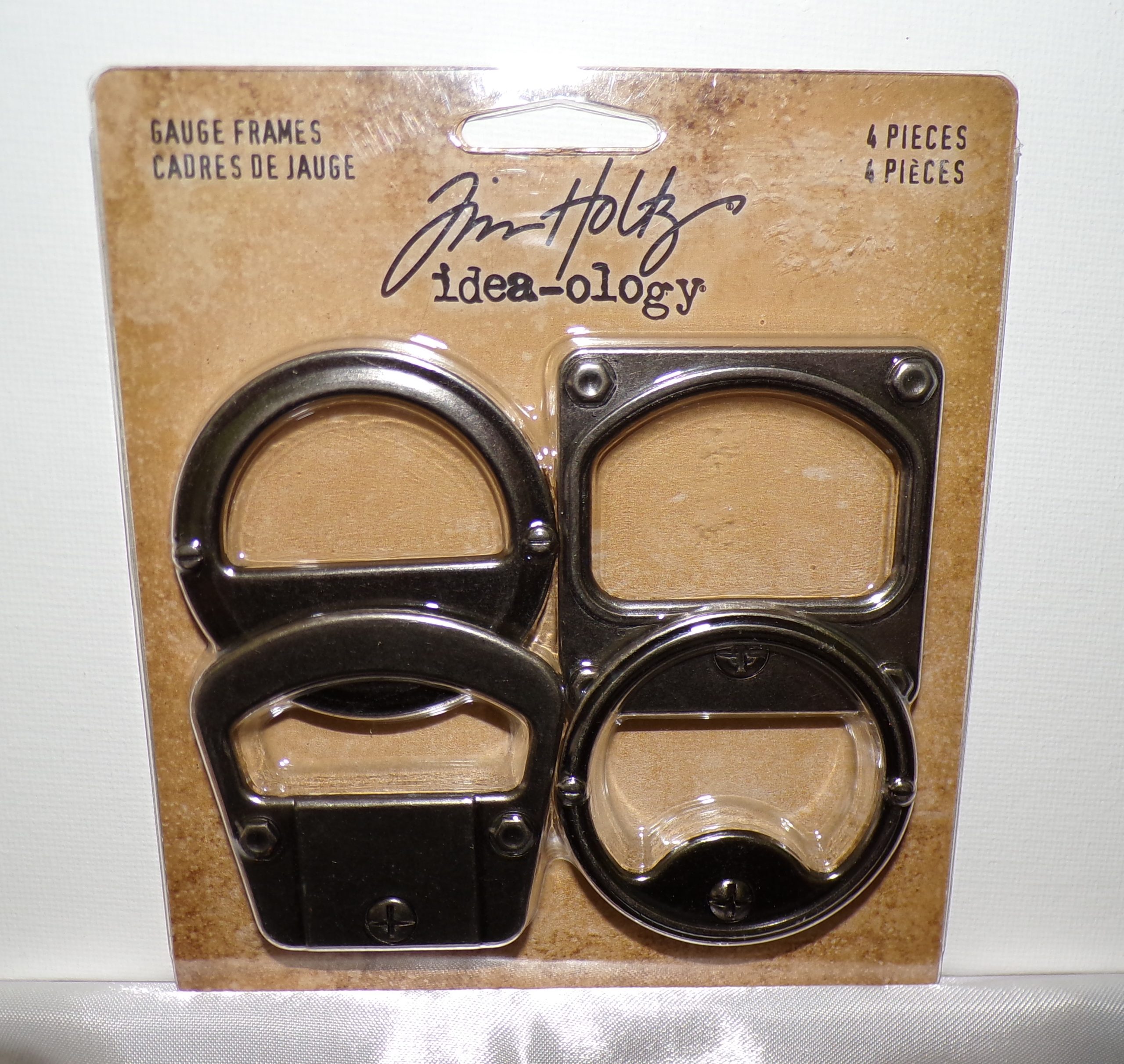These gauge frames are designed by Tim Holtz for Idea-ology. They are made of metal with an antique nickel finish. Each frame measures 2″ x 2″ with varying sized windows. These metal frames can be used as adornments or as a label holder for scrapbook pages, cards, mixed media projects, anywhere you need a little dimension.