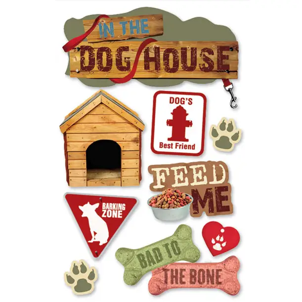 Three-dimensional dog-themed stickers with photographic details and mixed-media accents for paper crafts