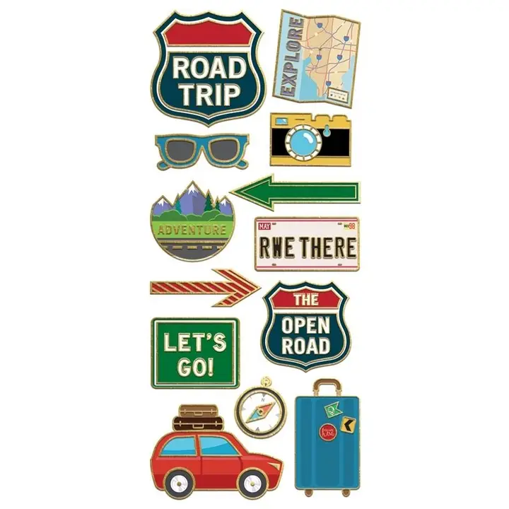 Lightweight travel-themed stickers with gold foil accents and a 3D enamel-look finish
